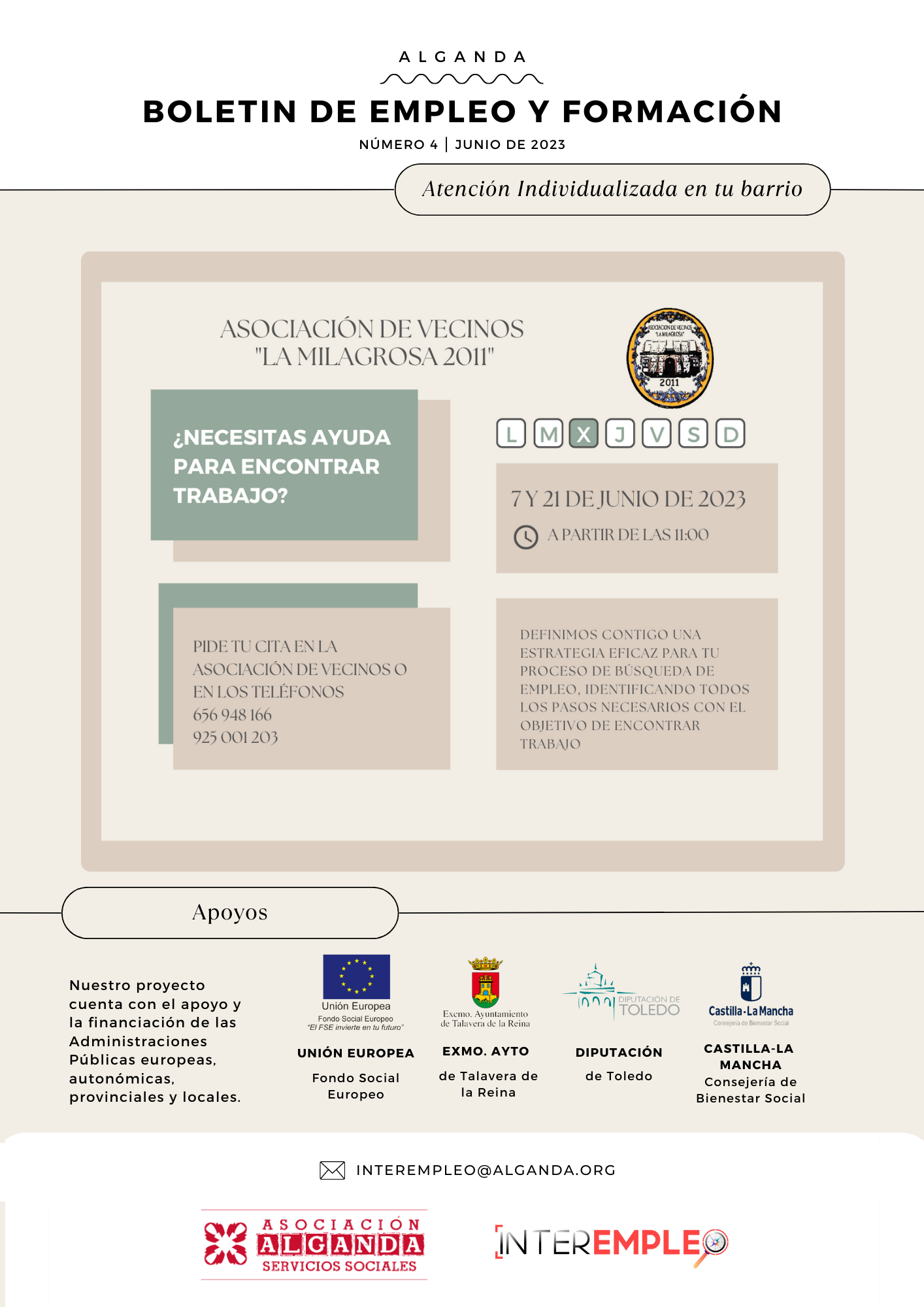 Desde el proyecto INTEREMPLEO facilitamos el acceso al mundo laboral mejorando la empleabilidad mediante una atención integral. En nuestro BOLETÍN EMPLEO Y FORMACIÓN JUNIO 2023 encontrarás información actualizada, accesible y de utilidad sobre formación disponible y las ofertas de empleo que de Talavera de la Reina y comarca.