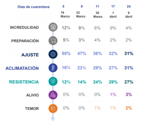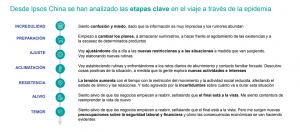 En IPSOS, podemos encontrar estos dos gráficos, el primero describe las siete etapas comunes a partir de las investigaciones en China y la segunda corresponde a las etapas en las que manifiestan estar los españoles en función de la semana.
